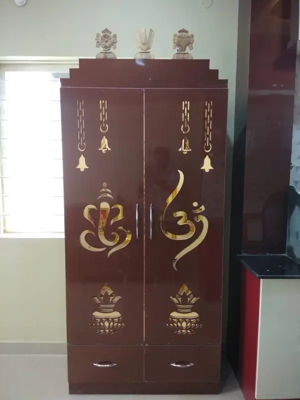 Bed room wardrobe work at Banjarahills, Hyderabad. 18 mm Gurjan plywood with two Almarahs white and Meroon coloured decolam doors, included cnc edge cutting edge for dressing table with two drawers with copper colour handles.
