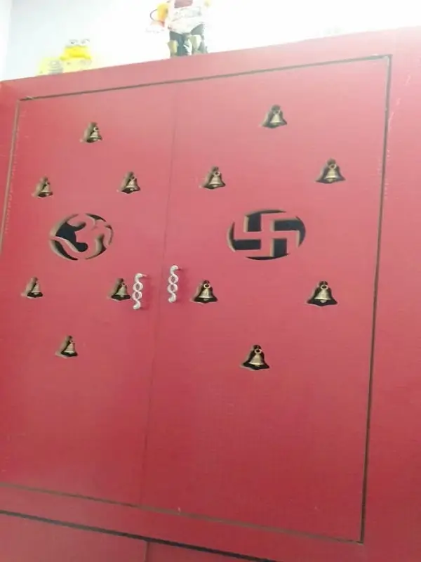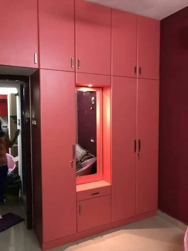 Bed room wordrobe with middle dressing included with drawers at Alwal. Greenply plywood with red decolam and stainless steel handles. Customer special interest on red due to her flore marble are white ceiling white.