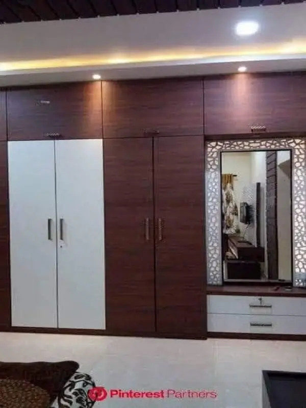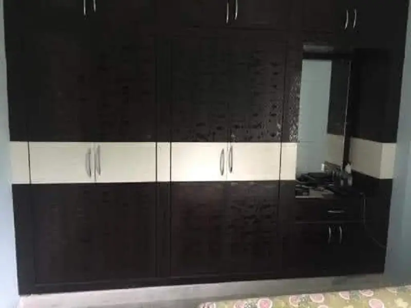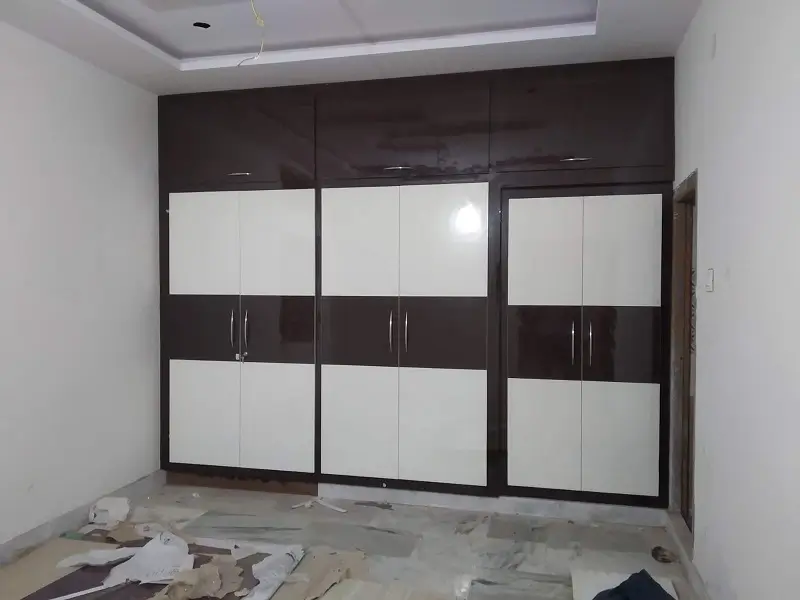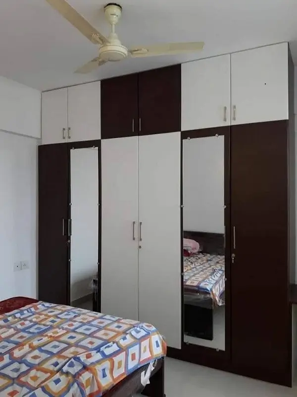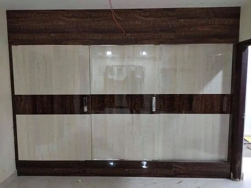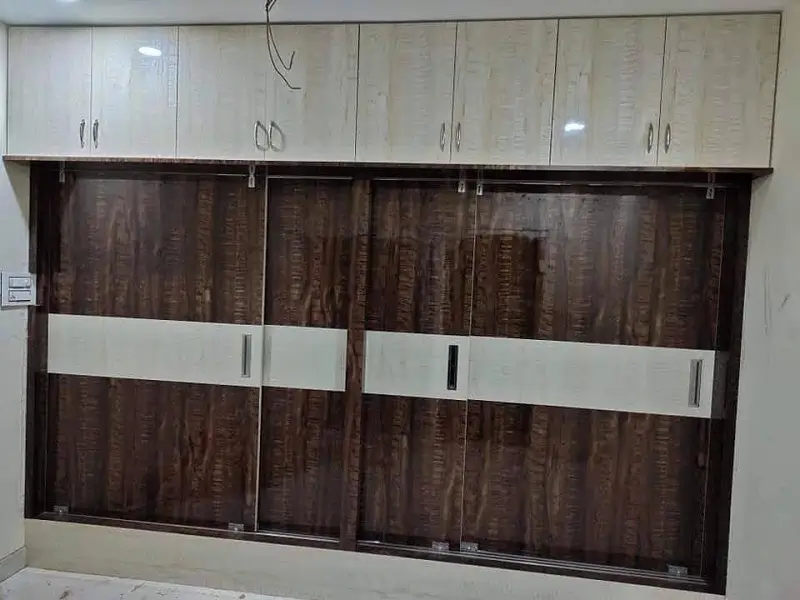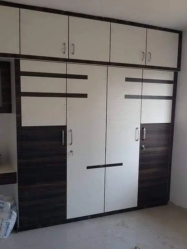 Bed room cubboard work at Suchtra circle Hyderabad. 18mm plywood with white and chocolate colored decolam y shaped design and stainless steel handles with openeble two mirrors almara type.