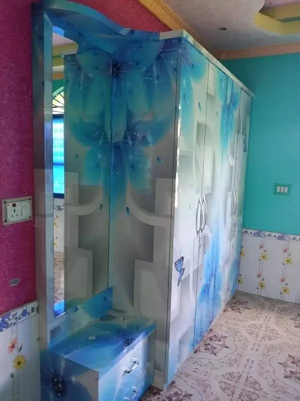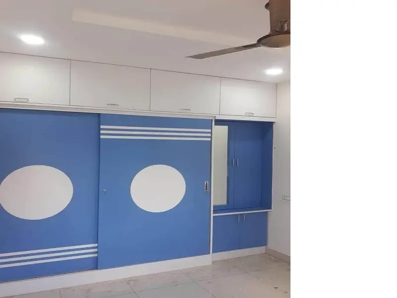 Sliding Wordrobe work near TV9, Banjarahills, Hyderabad. Blue and White decolam with dressing table included. Stainless stell sliding handles and master strokes at bottom and top with middle round white design.