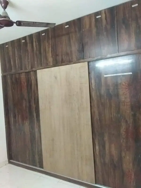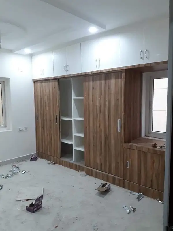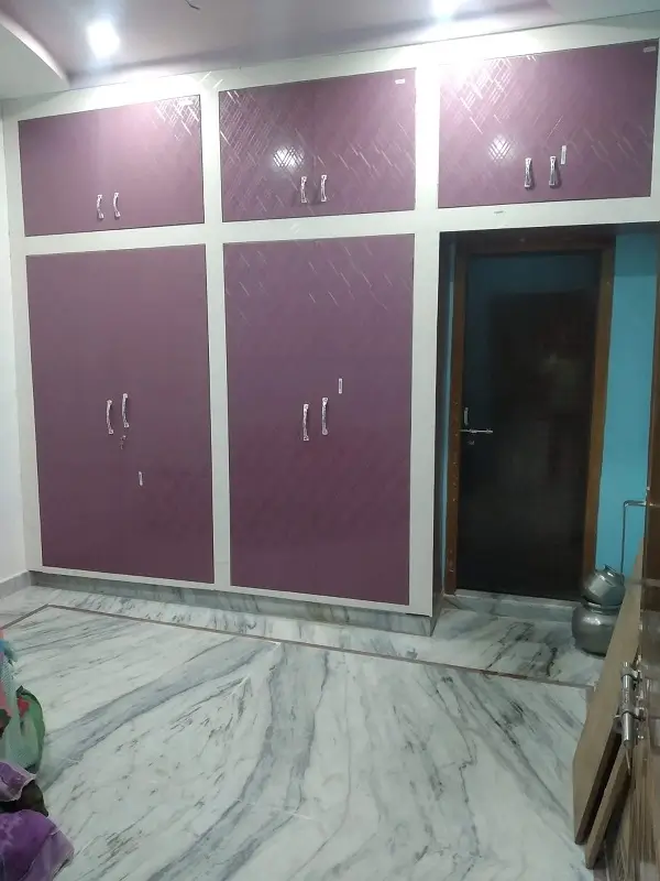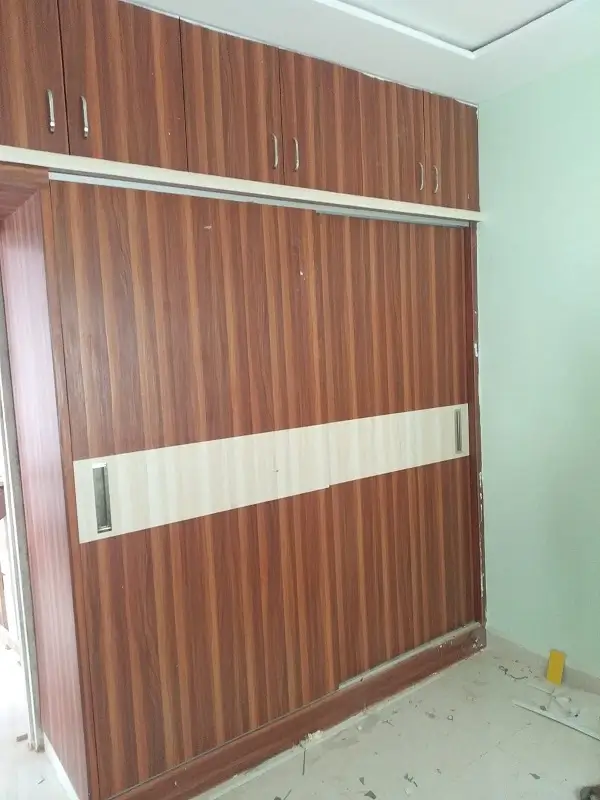 Bedroom wordrobe work at Kompally. Gurjan plywood with takewood and chocolate colored decolam at first floor.