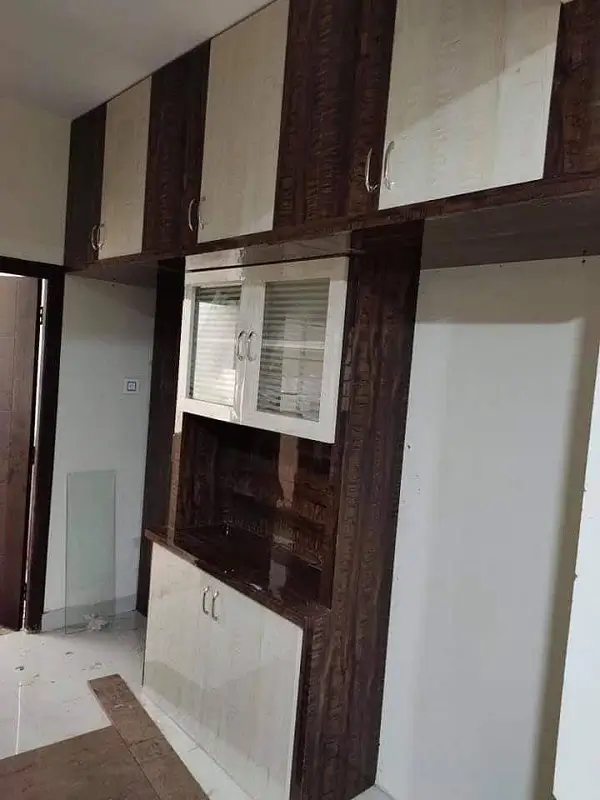 crockery unit design work nizampet Hyderabad. Sajja with cubboards, side shelf doors, microwave oven placement. Takewood with cholate mix, White and cream colour high glossy decolam for dining hall.
