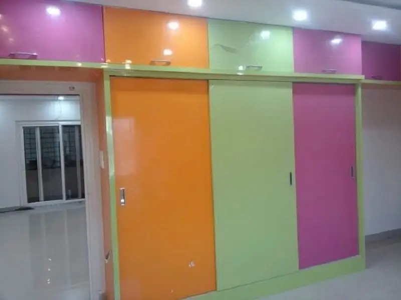 Multi colour sliding wardrobe work at Yousufguda. On Greenply Plywood Orange, Green and Pink decolam with sliding handles with soft close channels.