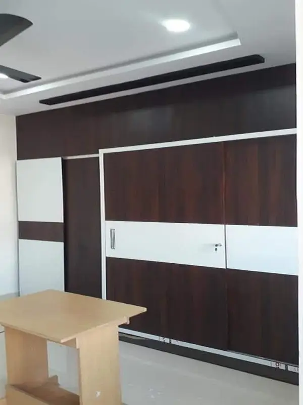 Bedroom cubboard work at Kalyan nagar, Motinagar Hyderabad. White decolam with chocolate colour strips.