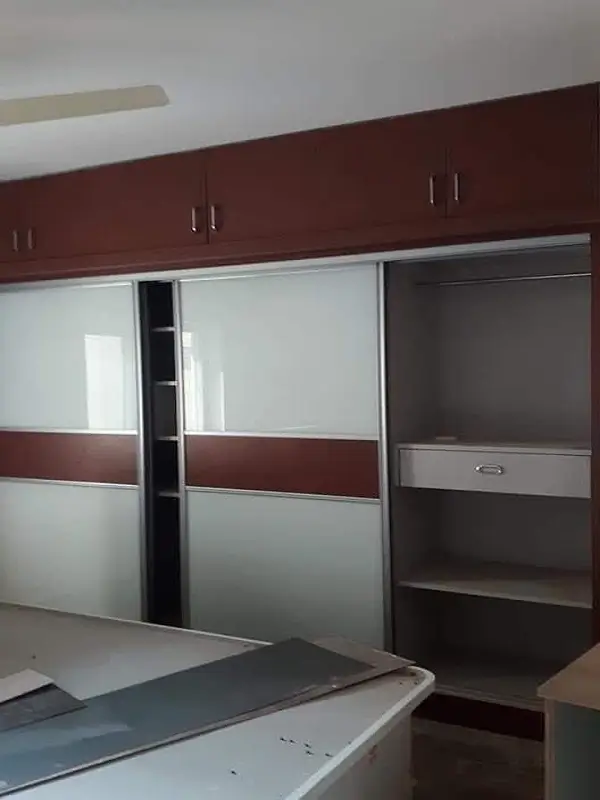 Bedroom Profile Wardrobe Sliding soft closer work at Srinagar Colony, Hyderabad. Red rosewood, Glossy white Acrolic Sheets with Alluminium Borders.