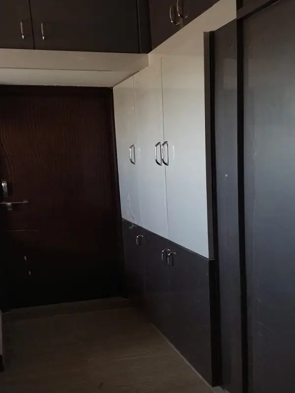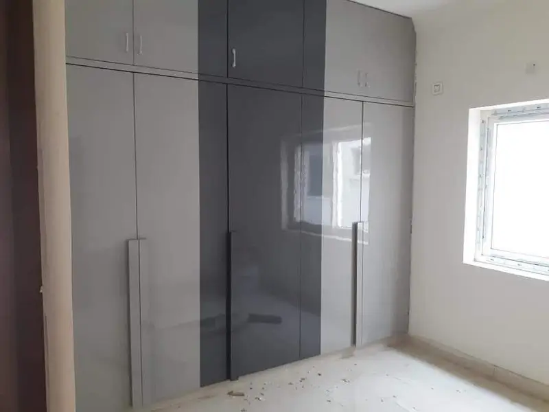 Bedroom Wardrobe work at Banjrahills, Hyderabad. High glossy white and grey decolam with long wood handles.